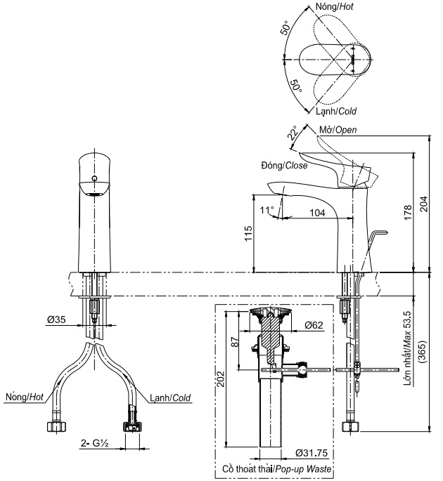 - Áp lực nước: 0.05MPa ~ 0.75MPa